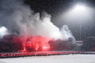Les supporters valaisans du Grandin Nord chantent et allument des fumigenes devant le terrain recouvert de neige lors de la rencontre de football de Challenge League entre FC Sion et FC Stade Nyonnais le vendredi 1 decembre 2023 au stade de Tourbillon a Sion. Le match au sommet de Challenge League entre Sion et le Stade Nyonnais prevu ce soir a Tourbillon est reporte en raison de la neige. (KEYSTONE/Jean-Christophe Bott)