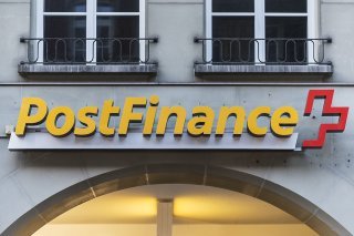 Le logo de Postfinance dans sa succursale de la Aarbergergasse à Berne (photo d'archives)